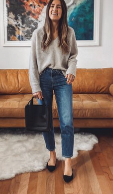 I absolutely love this look! I think it is the perfect way to make straight leg jeans feel really chic. Pairing them with booties elongates your legs, and with a cute sweater front tucked you look tall and lean! I think this look isn't too dressy but looks stylish and also allows you to be cozy in a sweater. This is like the perfect fall/ winter outfit to wear with those straight leg jeans! This is also the perfect way to add a little pop of color in your outfit if you are feeling bold, because you can wear any color sweater with jeans and booties!!